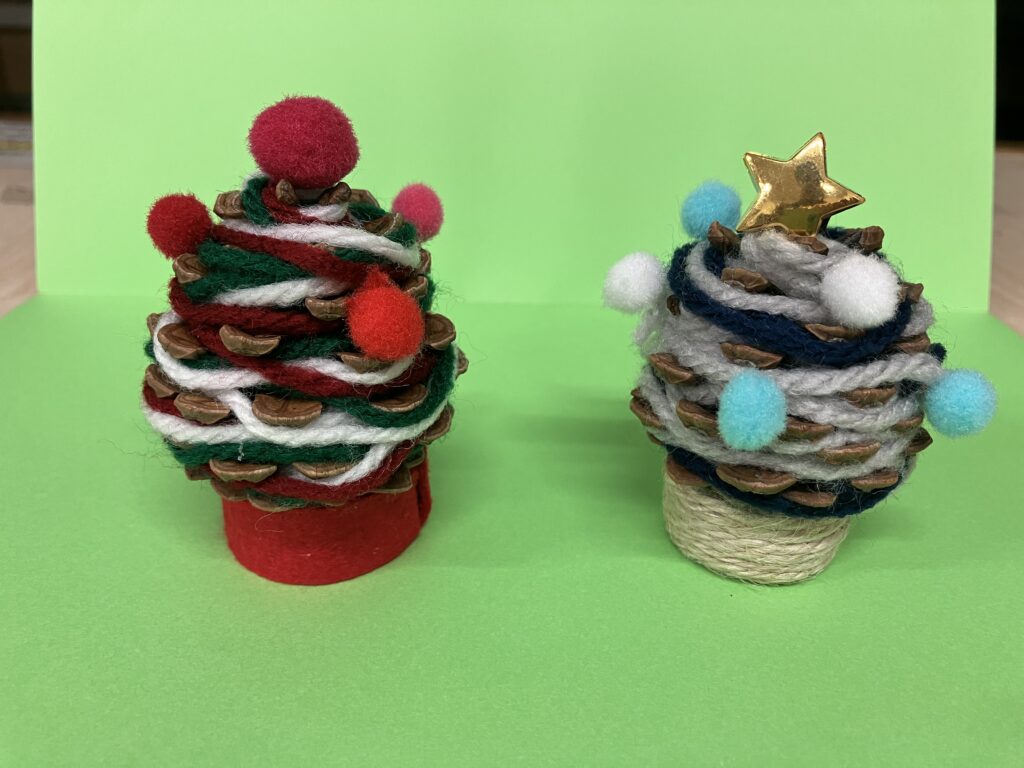 尾鷲ヒノキをツリー型にカットした板にポスカで色をぬって、ビーズを貼り付けて卓上クリスマスツリーの出来上がり!