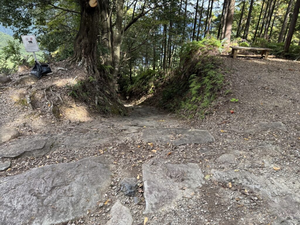 馬越峠の尾鷲側は傾斜あるので下から見ると階段状なのがわかる。10歩上がり3回深呼吸を繰り返しをしながらゆっくり登った。無理はしない、できない!と。まあそれほどボクにはキツイ道だったか。深呼吸大切。身体に酸素をいっぱい送り込まないとだめだ。