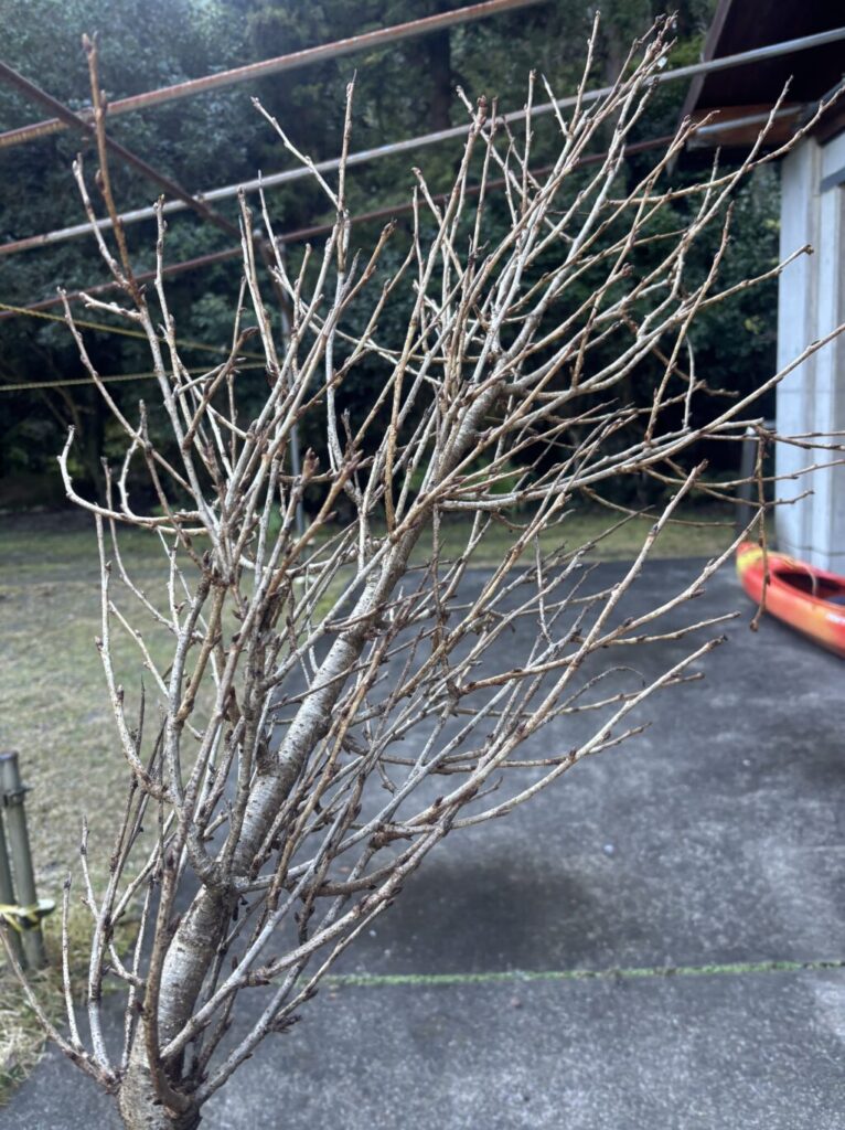 上の写真だとちょうど真ん中ぐらいの部分が枝もついてなく枯れてます。桜を剪定するには葉っぱが全部落ちてすぐの休眠期がベスト!