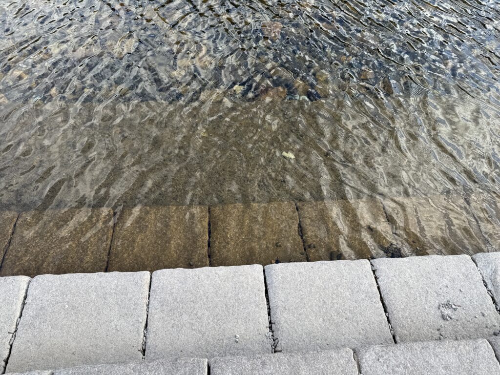水のラインからここは水深3メートル無いぐらいだなと。階段の色でわかりますね。