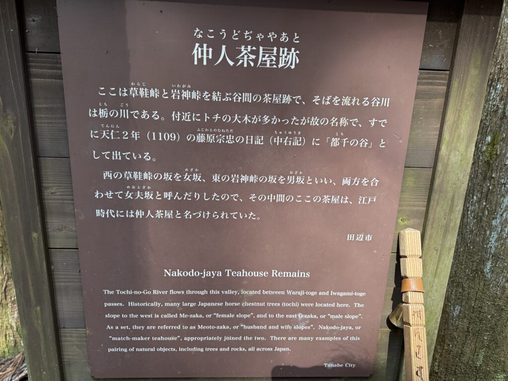 この林道を境に女坂、男坂がありその間にはこんな素敵な名前の茶屋があったのだとか。なんかロマンチックな気分になるボクだったね(笑)。