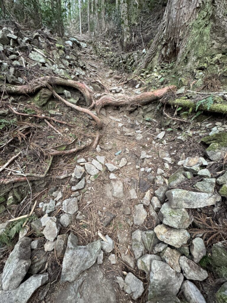 なんか荒れてる?と見えてしまいますが、ボクにはとても感動しましたな。画面右上の低い石垣、ボクの推測は全くあてになりませんが、当時この転がっている小石らで道を囲っていたのかな?と直感しました。この場所の周りの山にはこのような小石がいっぱいあり。だからこそ道を守るために少しでも役立てばと積んだのでは?と考えると当時の人の気持ちの温かさを感じたボクでした。この小石ぐらいなら女性や子供でも持てるからね。