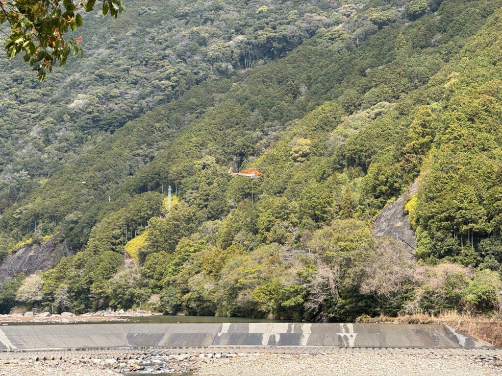 この田舎はヘリコプターが飛ぶのはドクターヘリか電線の点検ぐらいで珍しいのですが、やっぱりヘリコプターは音がでかくてびっくりしますね。ここではドクターヘリは銚子川の国道から少し下流の河川敷広場かな。